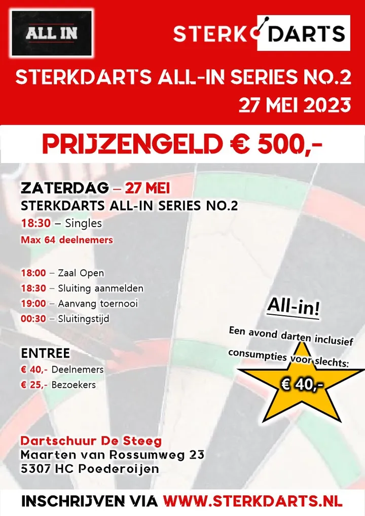 De "All-In Series", waarbij je voor 1 prijs een hele avond kunt darten inclusief je consumpties, krijgt een vervolg. De All-in Series No.2 wordt gehouden op zaterdagavond 27 mei in Poederoijen.