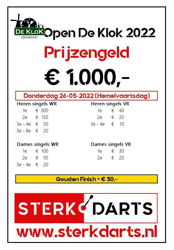 Een prijzenpot van € 1.000,- is beschikbaar gesteld voor deze editie van het Open De Klok. De winnaar bij de heren mag € 300,- in ontvangst nemen en de winnares van het damestoernooi neemt € 100,- mee naar huis.