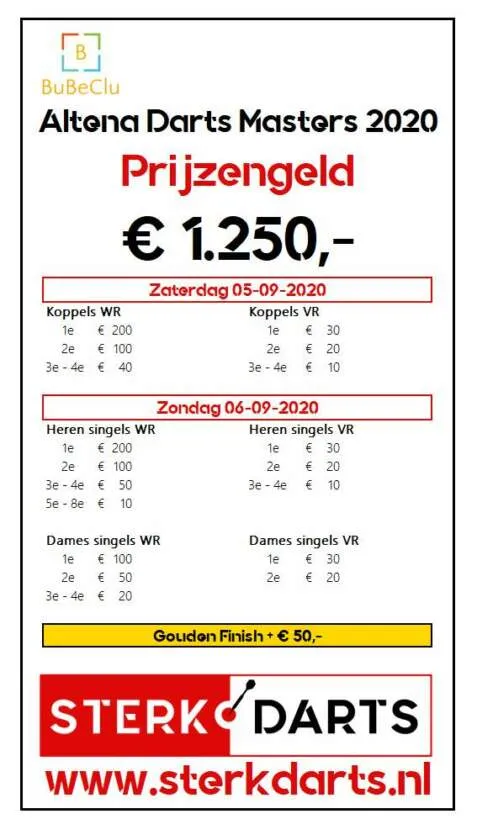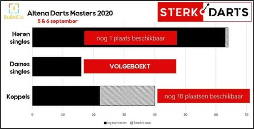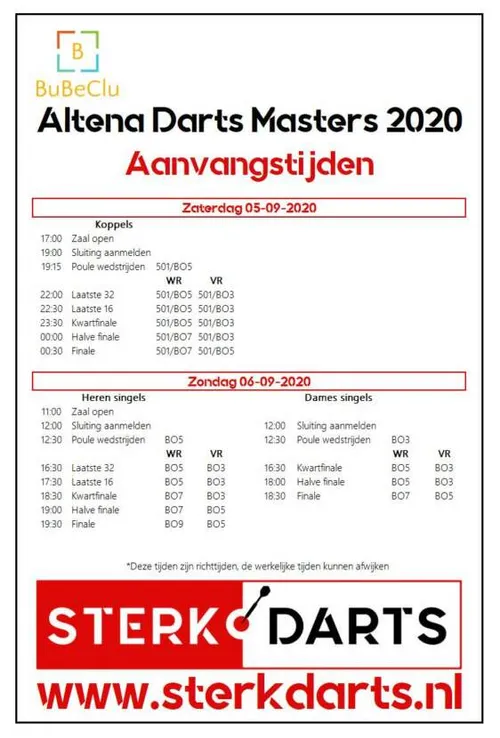 Vanavond start de Altena Darts Masters 2020 met een koppeltoernooi, inschrijven ter plaatse vanavond is mogelijk tot 19:00 bij de wedstrijdleiding.