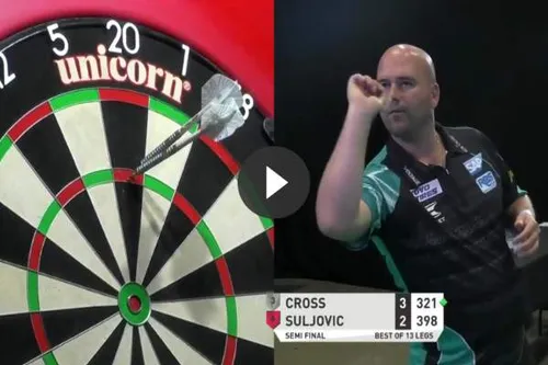 Rob Cross is er zojuist in geslaagd om een 9-darter te gooien in de halve finale tegen Mensur Suljovic. Hij deed dit in de zesde leg van de wedstrijd bij een 3-2 voorsprong. De partij werd gespeeld een televisiebaan en dus zijn de beelden .