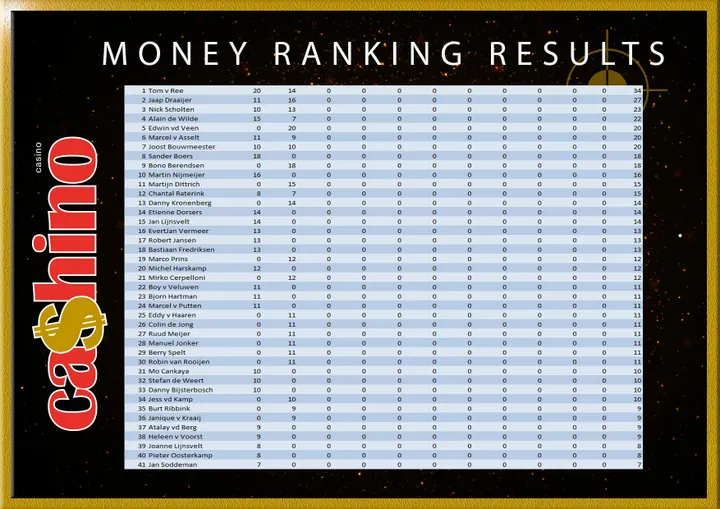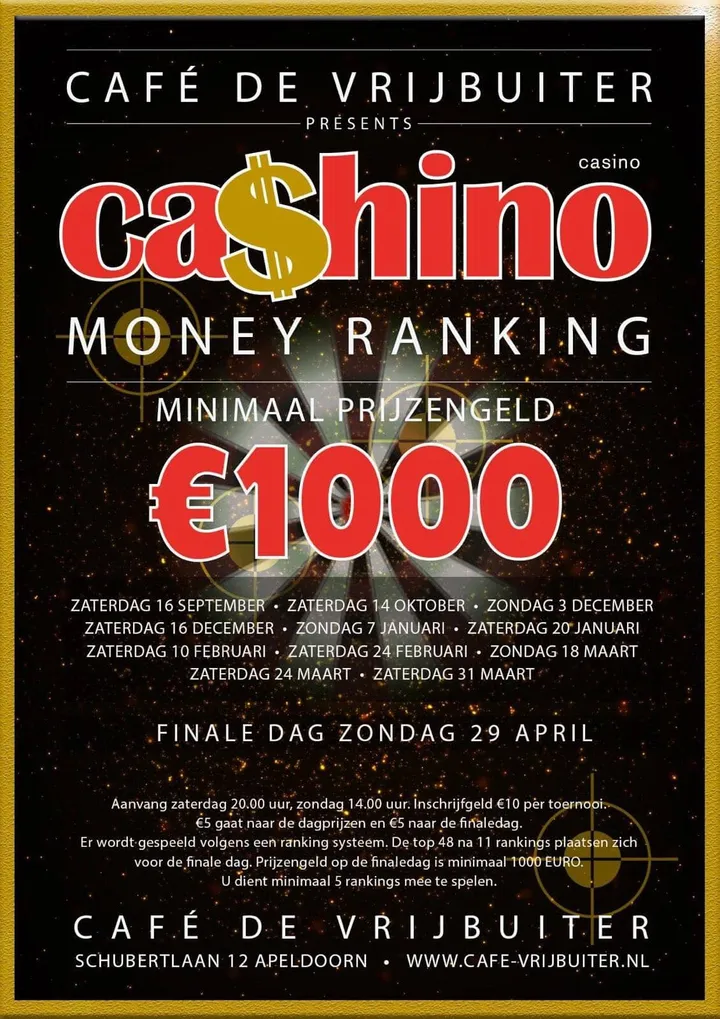Cashino Money Ranking. Plaats jij je voor de finaledag met een gegarandeerde prijzenpot van maar liefst 1000 euro? Kom dan a.s. zondag naar Café de Vrijbuiter in