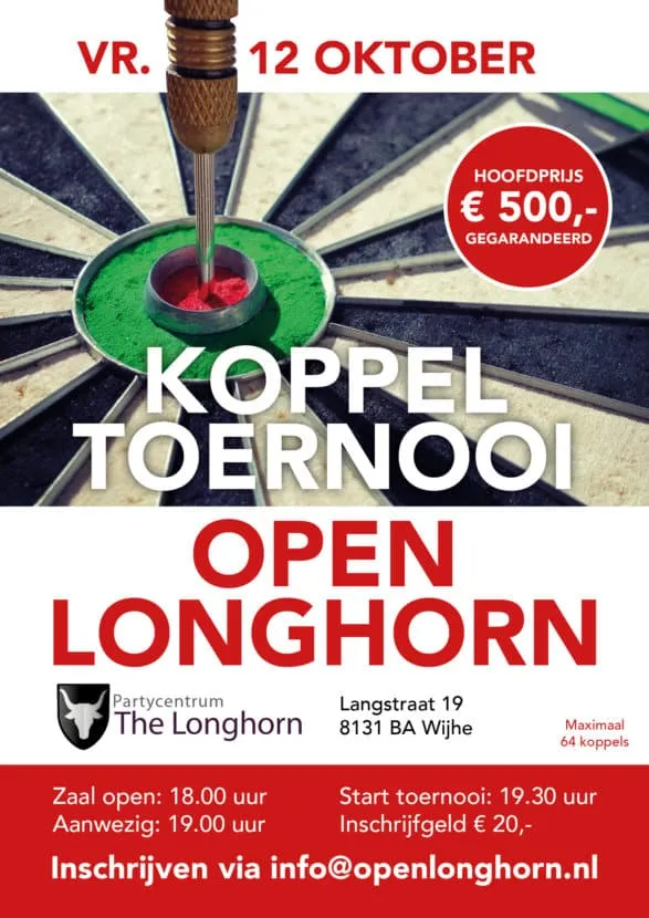 Aankomende vrijdag 12 oktober 2018 zal de 3e editie van het Open Longhorn koppeltoernooi plaatsvinden. Dit toernooi zal plaatsvinden in Partycentrum The Longhorn in het prachtige Overijsselse Wijhe.