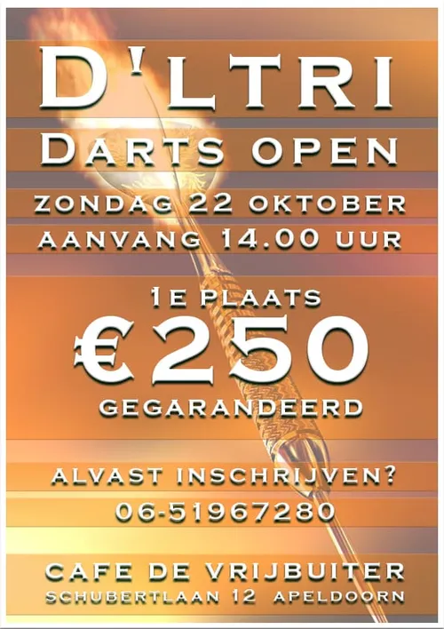 Zondag is het tijd voor de D'ltri Darts Open. Een gegarandeerde hoofdprijs van 250 euro ligt klaar voor de winnaar. Zondag starten ze om 14.00 uur. Alvast inschrijven kan via 06-51967280.