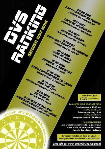 Zaterdag is de DVS ranking te gast in ons Café. De ranking begint om 19.30 uur. Inschrijven kan tot 19.15 uur. Voor de standen van de ranking klik hier.