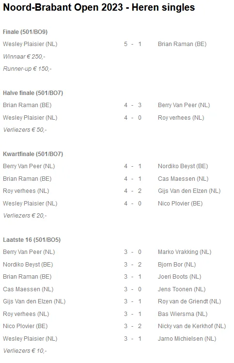 Wesley Plaisier heeft het Noord-Brabant Open 2023 op zijn naam geschreven. Brian Raman werd runner-up. Berry van Peer en Roy Verhees haalden de halve finale. De verliezersronde kwam op naam van Pim van Bijnen.