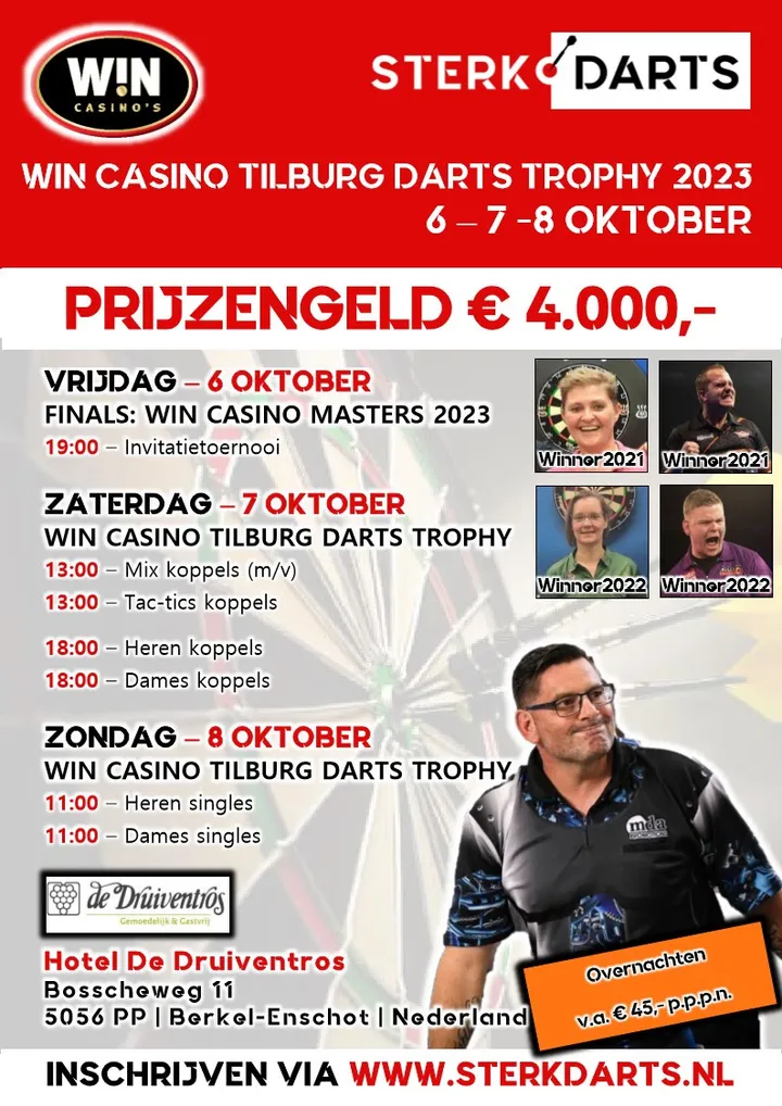 WIN Casino is de hoofdsponsor en naamgever van de WIN Casino Tilburg Darts Trophy 2023, dat op 6 t/m 8 oktober wordt gehouden in Hotel De Druiventros te Berkel-Enschot.