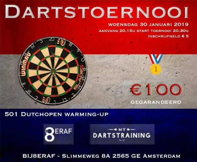 Op woensdag 30 januari organiseert Mydartstraining een 501 moneydarts. Inschrijven is mogelijk tot 20:15u op locatie.