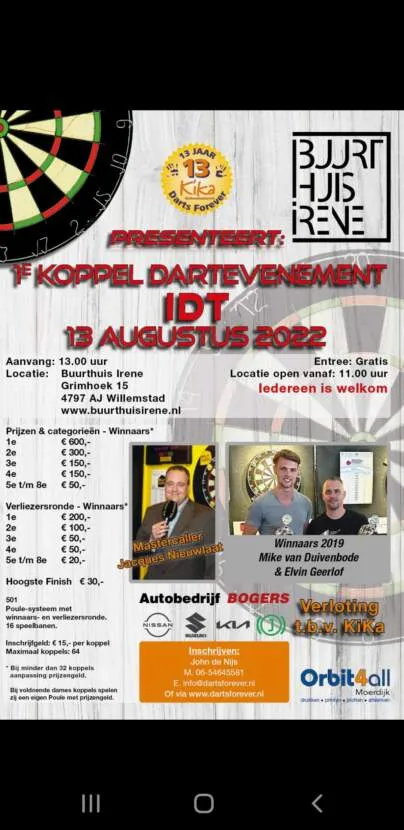 Zaterdag 13 augustus zal de eerste editie van koppel dartevenement IDT plaatsvinden. Er kan nog steeds worden ingeschreven voor dit evenement. Dit is het evenement wat voorheen op camping Bovensluis werd gehouden en nu is verplaatst naar een andere locatie, namelijk Buurthuis Irene in Willemstad met de nieuwe naam IDT.