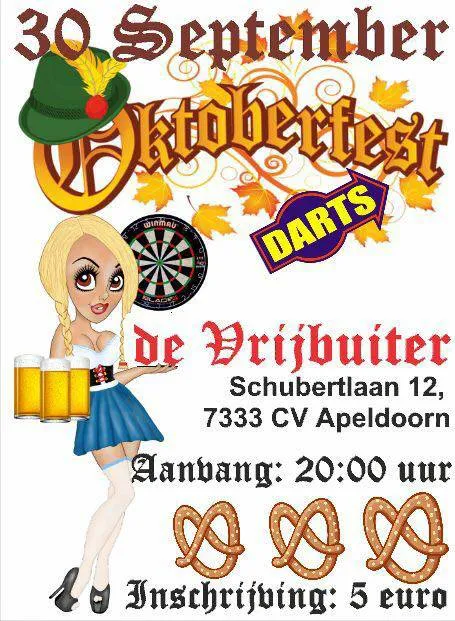 Zaterdag is het tijd voor Oktoberfest Darts. Een super leuk en gezellig toernooi voor iedere darter. Aanvang is 20.00 uur en het het inschrijfgeld is €5.