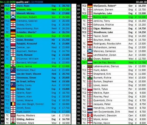 Een opsomming van alle virtuele deelnemers op basis van de PDC Order of Merit en de ProTour Order of Merit brengt Erik Middelkoop hieronder bij de stand op 10 oktober 2018.