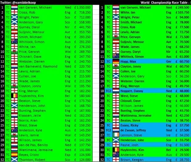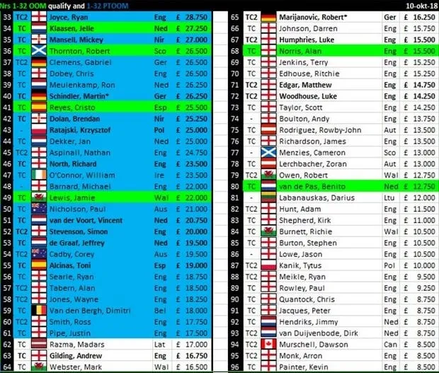 Een opsomming van alle virtuele deelnemers op basis van de PDC Order of Merit en de ProTour Order of Merit brengt