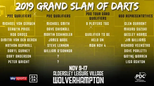 Michael van Gerwen, Wesley Harms, Richard Veenstra en Dimitri van den Berg zijn verzekerd van deelname aan de Grand Slam of Darts. Er kunnen echter nog een aantal Nederlanders of Belgen bijkomen via het kwalificatietoernooi van de PDC welke op maandag 4 november wordt gespeeld.
