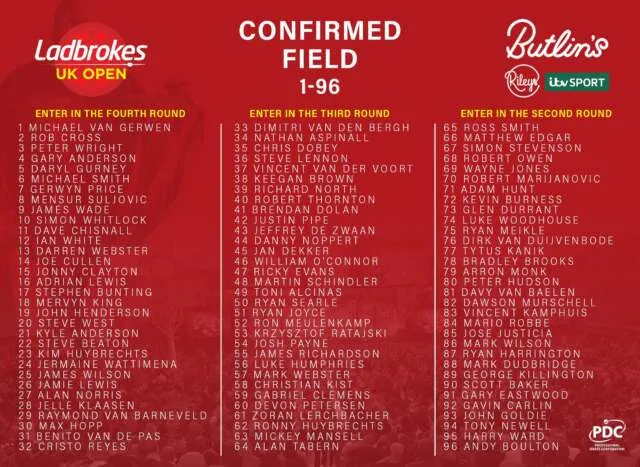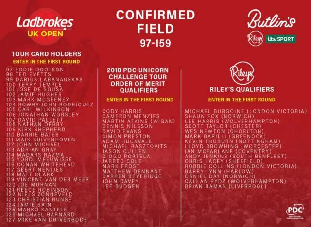 Aanstaand weekend staat bij de PDC de UK Open op het programma. Het toernooi kent zoals vanouds een open loting waarmee iedere ronde extra spannend wordt. Op vrijdag gaat het toernooi, dat 160 deelnemers telt, van start. Tot deze groep behoren 20 Nederlanders die ieder op een eigen moment instromen. Maik Kuivenhoven, Geert Nentjes,