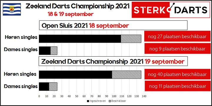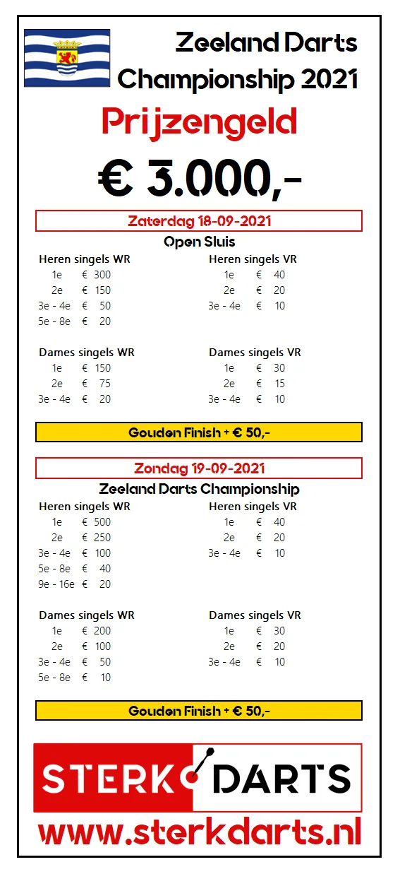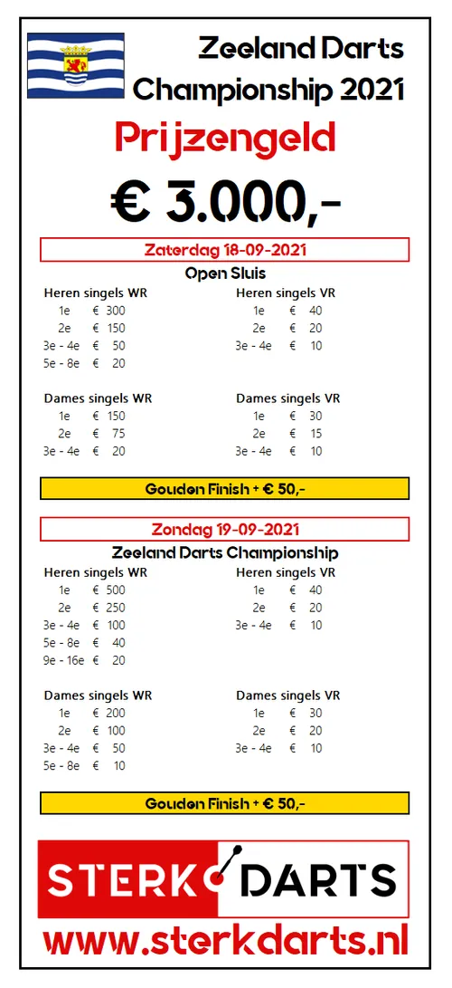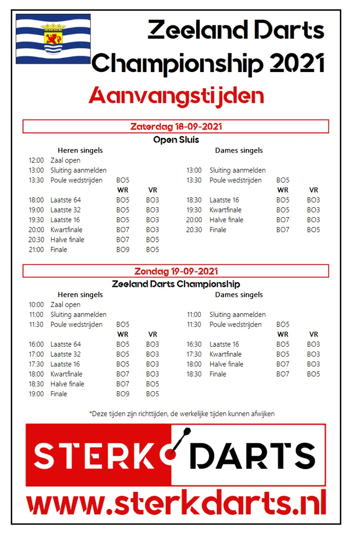 In onze reeks Darts Championships gaan we alle provincies van Nederland aan te doen. De weekenden Darts Championships bestaan alle uit twee dagen singel toernooien in de categorieën heren en dames. Zo ook dus het Zeeland Darts Championship 2021 in De Keure. Op zaterdagmiddag 18 september vindt het Open Sluis plaats. Een dag later, op zondag 19 september wordt er gestreden om de titel Zeeland Darts Championship 2021!