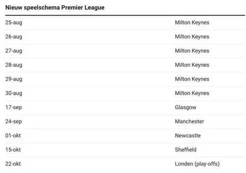 De speelavonden in Birmingham, Belfast, Leeds, Berlijn en Rotterdam zijn van de kalender gehaald en verplaatst naar 25 tot en met 30 augustus. De Premier League-deelnemers spelen dan zes dagen achter elkaar, achter gesloten deuren, in de Marshall Arena in Milton Keynes.
