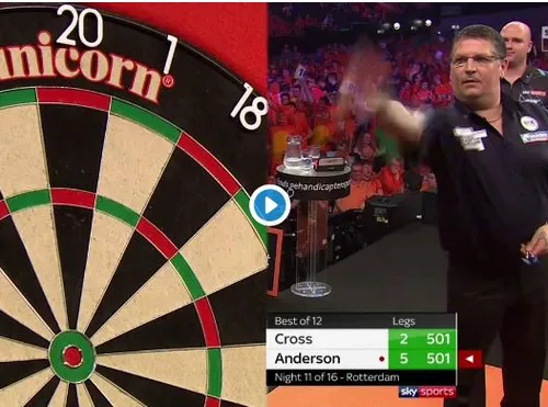 De avond werd bijna sensationeel afgesloten door Gary Anderson in zijn duel met Rob Cross. The Flying Scotsman was in de eerste 6 legs foutloos op de dubbels en in leg 7 leek hij ook de triple niet te kunnen missen. Hij opende met tweemaal 180 en mocht vervolgens aanleggen voor de 141-finish. Het publiek in Ahoy ging massaal op de banken staan in de hoop getuige te zijn van een stukje dartsgeschiedenis. Zie hieronder de poging van The Flying Scotsman om zich onsterfelijk te maken tussen de oranje menigte.