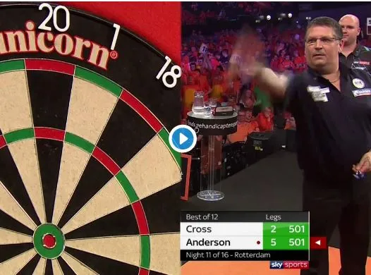 Gary Anderson in zijn duel met Rob Cross. The Flying Scotsman was in de eerste 6 legs foutloos op de dubbels en in leg 7 leek hij ook de triple niet te kunnen missen. Hij opende met tweemaal 180 en mocht vervolgens aanleggen voor de 141-finish. Het publiek in