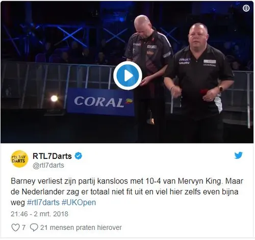 Raymond van Barneveld leek bevangen te zijn van de kou op de UK Open. Tijdens zijn partij met Mervyn King leek hij enkele keren bijna flauw te vallen. Desondanks werd de partij voortgezet waarbij de winst met 10-4 naar Mervyn King ging. Angstige beelden waarbij de Nederlander het bewustzijn even leek te verliezen zijn hieronder te bekijken.