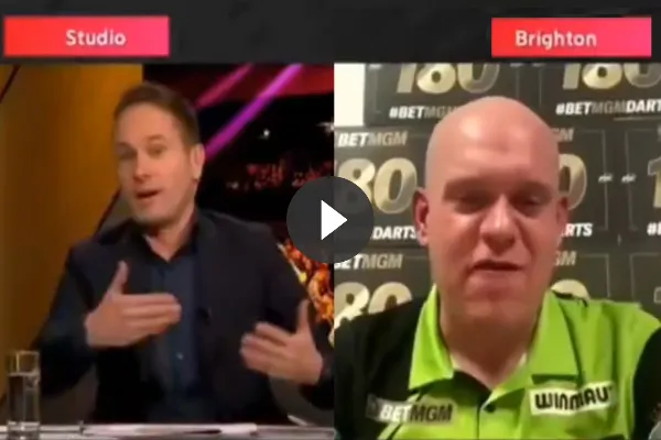 De presentator kan ook geen antwoord geven op de vraag van Michael van Gerwen waarom Arjan van der Giessen niet aanwezig is en vanaf dat moment begint het interview gênant en ongemakkelijk te worden. Bart Nolles probeert het interview daarna nog een twist te geven maar daar wilde de sloopkogel, die deze wedstrijd in een nieuw shirt speelde, niets van weten.