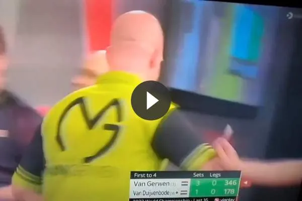 Michael van Gerwen werd aangeraakt. Tegelijkertijd benadrukte hij dat hier geen opzet achter zat en dat dit er niet voor heeft gezorgd dat hij heeft verloren. Het moment waarop Van Gerwen zijn tegenstander raakt terwijl die wil aanleggen om te gooien is te bekijken op .