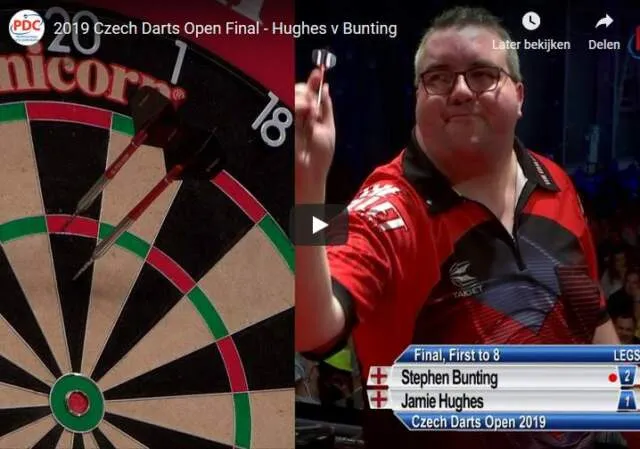 Jamie Hughes tot de finale van de Czech Darts Open. Het werd een duel die magistraal zou eindigen voor Hughes. Het toernooi was exclusief te volgen voor abonnees van PDC TV, maar inmiddels heeft de PDC de beelden van de finale openbaar geplaatst. Natuurlijk willen we jullie deze niet onthouden en dus kun je nu de finale hieronder bekijken waarbij in de derde leg één van de mooiste checkouts van het toernooi werd gegooid gevolgd door een poging voor een 9-darter.