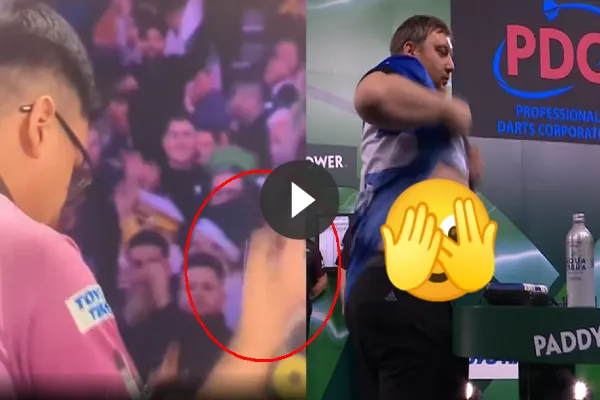 Rusty-Jake kon zijn woede niet meer onder controle houden toen hij op een 0-2 achterstand in sets kwam. Hij smeet zijn pijlen zo hard op het tafeltje dat ze van het podium af vlogen. Een cameraman zag een pijl net achter zich landen en op bovenstaande beelden is te zien dat hij deze teruggaf aan de Oostenrijker.