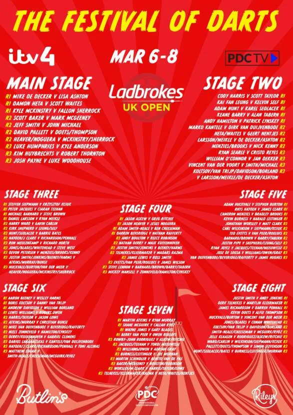 Fallon Sherrock volgend weekend van de partij zijn wanneer van 6 tot en met 8 maart de UK Open 2020 wordt gespeeld. Ashton treft in haar eerste partij de Belg Mike de Decker en Fallon Sherrock speelt tegen Kyle McKinstry. De dames zullen vrijdagmiddag openen op het hoofdpodium. Het volledig speelschema verdeeld over de 8 podia zie je hieronder.