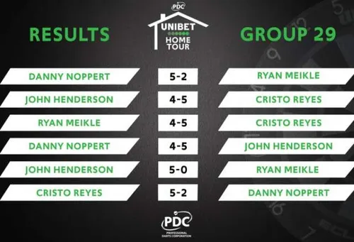 Vrijdagavond heeft Cristo Reyes de 29e speeldag van de PDC Home Tour gewonnen. Hij won alle 3 de wedstrijden en versloeg ook Danny Noppert die met 2 punten op de derde plaats eindigde.