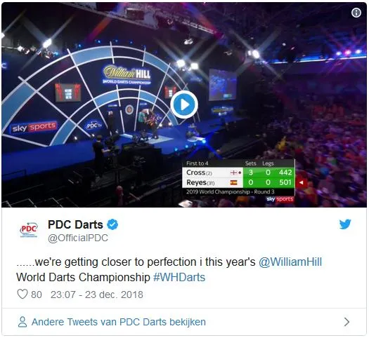 Tegen Rob Cross kon Cristo Reyes zondagavond geen vuist maken ondanks een gemiddelde van 96,20. Bij een 0-3 achterstand in sets leek hij zich dit ook te beseffen waardoor hij alle zenuwen los kon laten en vrijuit kon gooien. Het resulteerde bijna in een unieke prestatie die we slechts 9 keer eerder zagen op het PDC WK. We hebben het dan natuurlijk over een 9-darter op het belangrijkste toernooi van het jaar. In 2009 gooide