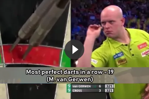 Michael van Gerwen op het PDC WK tegen James Wade. Maar de Nederlander wist ooit nog meer perfecte pijlen op rij te gooien. Dit is bovendien op video vastgelegd en is samen met nog 16 bizarre wereldrecords