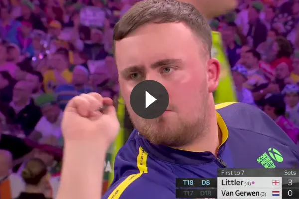 Luke Littler versloeg hem niet alleen met overtuigende cijfers maar hij gooide daarbij ook de officieel smerigste finish ooit in een WK finale zoals te zien is op