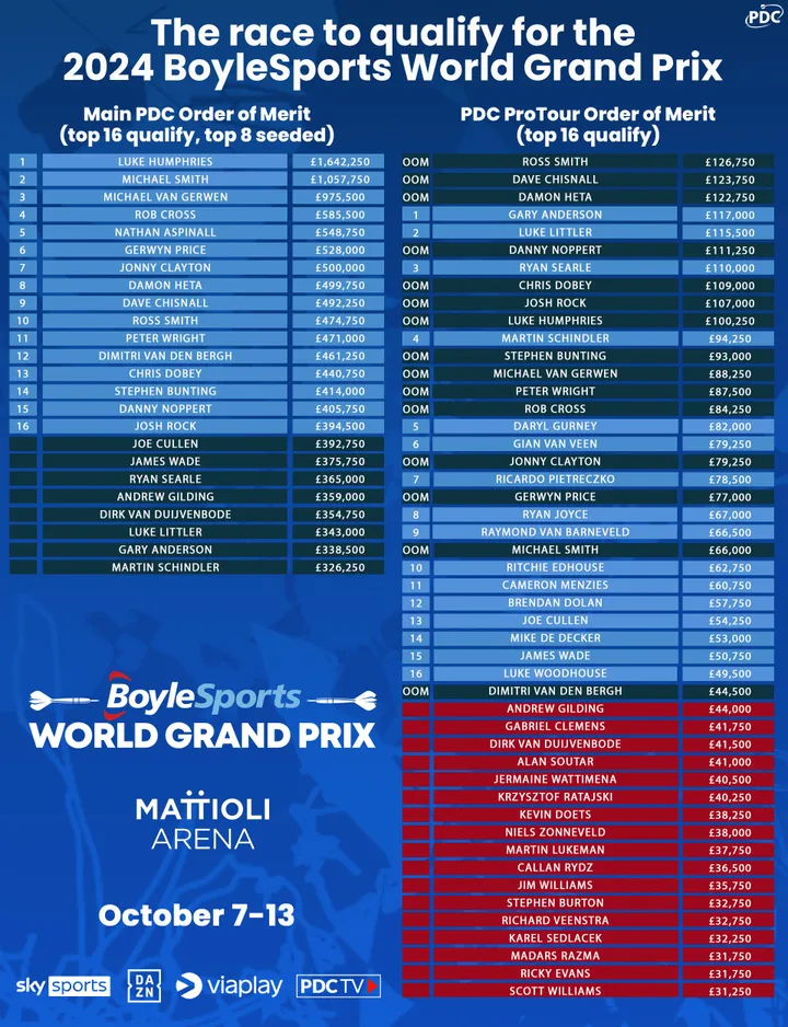 Met de sluiting van de kwalificatie op 30 september komt de eindfase van het seizoen snel dichterbij. Spelers die zich nog willen plaatsen voor de BoyleSports World Grand Prix 2024 zullen dit weekend in Antwerpen en de daaropvolgende toernooien alles moeten geven om hun kansen te maximaliseren.