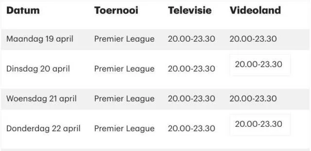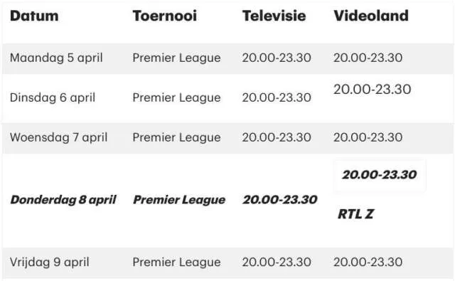 Inmiddels kunnen we melden dat al deze avonden live te volgen zullen zijn via RTL 7 waarbij alleen op donderdag 8 april moet worden uitgeweken naar RTL Z.