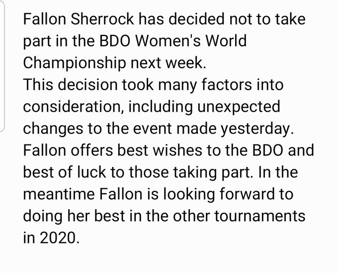 "Fallon Sherrock heeft besloten om niet deel te nemen aan het damestoernooi van het BDO WK 2020 volgende week. Dit besluit komt voort uit meerdere factoren waaronder de onverwachte aanpassingen zoals deze gisteren naar buiten zijn gekomen. Fallon wenst iedereen de BDO al het beste toe en wenst succes aan alle deelnemers. Ondertussen is Fallon vooruit aan het kijken om haar best te doen in de aanstaande toernooien in 2020."