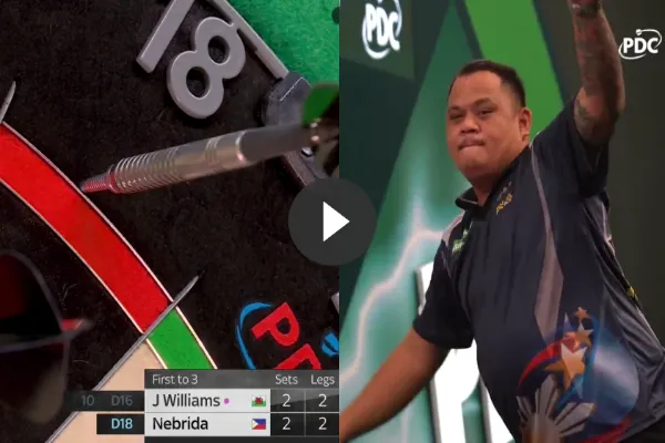 Tijdens het duel met Paolo Nebrida en Jim Williams kwam het aan op een beslissende laatste leg en daarin dacht de Filipijn 96 uit te gooien voor de winst. Maar hij bleek iets te vroeg te juichen en wat er toen gebeurde bekijk je op