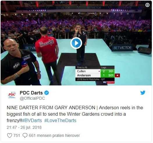 Wes Newton. Allen wisten ooit op de Matchplay een perfecte leg te gooien. Beelden van de perfecte leg van Gary Anderson zijn hieronder te zien.