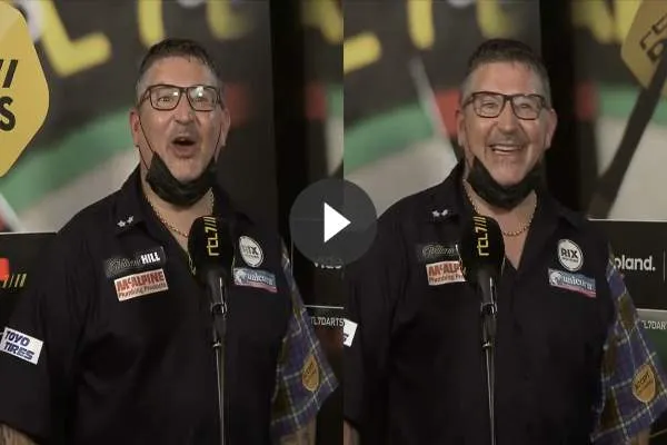 Gary Anderson de kwartfinale van het PDC WK tegen Luke Humphries. Maar alvorens het zover is wil The Flying Scotsman iedereen nog een gelukkig nieuwjaar wensen, maar dan wel in het Nederlands. Het leverde een komisch moment op zoals .