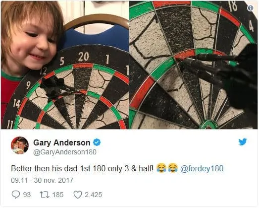 Gary Anderson wist deze week voor het eerst drie pijlen in de triple 20 te gooien. Tai Anderson is pas een halve meter hoog en dus staat zijn dartbord op een stoel maar dat maakt de prestatie er niet minder op. Tweevoudig wereldkampioen en trotse vader Gary Anderson plaatste onderstaande tweet. Dit belooft veel goeds voor de toekomst en wellicht schuilt er in Tai Anderson een ware opvolger van zijn vader. Althans Tai zelf ziet dat iets anders. Hij zou graag de boeken in gaan als opvolger van