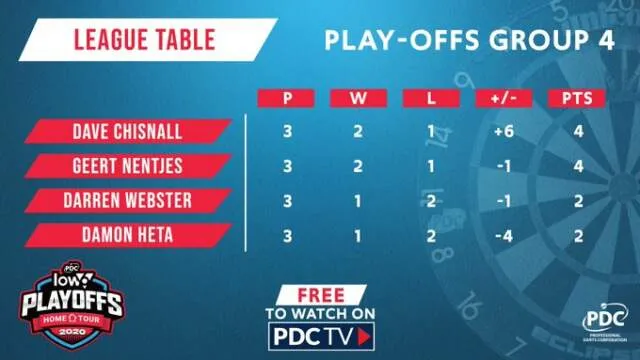 Dave Chisnall en die wist de Nederlander met 6-3 te verslaan waardoor ze op een gelijk aantal punten uitkwamen maar met een beter legseldo was het Chizzy die zich bij de laatste 8 voegde.