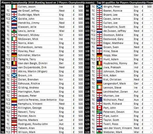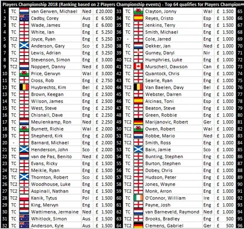 De volledige rankingstand met bijbehorende ponden na twee Players Championships is hieronder weergegeven.