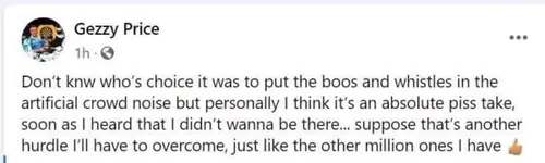 “Ik weet niet wie met het idee kwam om boe-geroep en gefluit toe te voegen in de geluidsband van het publiek. In mijn ogen is dat gewoon een naaistreek en toen ik dat hoorde wou ik niet eens meer op het podium staan. Het zal wel weer een hindernis zijn die ik moet zien te overwinnen, zoals ik er al miljoenen heb,” aldus een gefrustreerde Price.