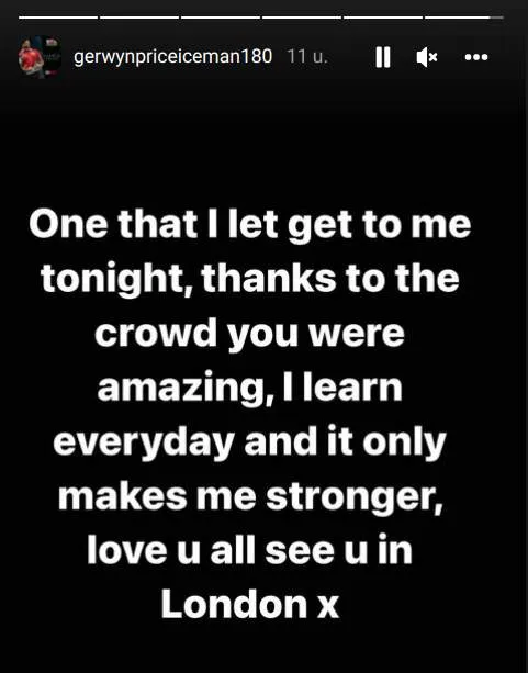 Inmiddels heeft ook The Iceman gereageerd op het voorval: "Ik heb mij uit de tent laten lokken. Bedankt aan het publiek, jullie waren geweldig. Ik leer nog iedere dag en dit maakt mij alleen met sterker. Ik zie jullie weer in Londen."