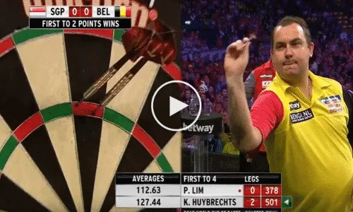 Kim Huybrechts heeft het Belgische record van zijn broer, die gisteren 115,62 gooide, binnen 24 uur alweer verbroken. The Hurricane versloeg Paul Lim in de openingspartij van België tegen Singapore met maar liefst 121,97. Hiermee versloeg hij niet enkel het hoogte Belgisch gemiddelde ooit op tv maar hij versloeg zelfs bijna het hoogte gemiddelde ooit gegooid op tv bijna. Het record staat op naam van Michael van Gerwen met en Huybrechts heeft nu het op één na hoogste gemiddelde ooit te pakken. Paul Lim stond ook uitstekende te gooien met lange tijd 115,00 gemiddeld maar hij zou uiteindelijk op 100,40 uitkomen. De volledige wedstrijd is hieronder te bekijken.