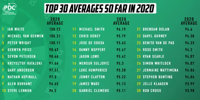 De PDC heeft de gegevens vrij gegeven van het overall gemiddelde van haar spelers berekend over heel 2020.
