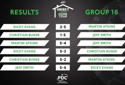 Jeff Smith is winnaar geworden van de PDC Home Tour 16. Hij wist boekte net als Martin Atkins twee overwinningen maar won de avond op legsalgo. Hij besloot de avond bovendien in stijl af met een 147-finish tegen Ricky Evans.