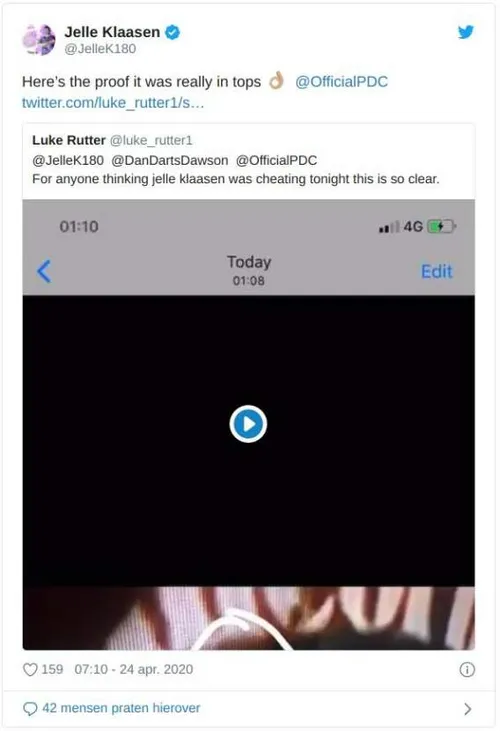 Jelle Klaasen won speelavond 7 van de PDC Home Tour maar kreeg na afloop toch een lading kritiek over zich heen. Hij zou vals hebben gespeeld tijdens zijn partij tegen Gabriel Clemens door te claimen dat een dubbel raak was terwijl dat niet het geval zou zijn. Volgens lijkt het er inderdaad ook op dat dit het geval was. Echter blijkt de steel anders in de vork te steken. Jelle Klaasen kwam met onderstaande beelden op Twitter waarin het bewijs wordt getoond dat de dubbel toch echt raak was. Op de foto is het nog bijna niet te zien omdat hij met dunne punten speelt maar leveren het bewijs. Om herhaling te voorkomen heeft de Nederlander bovendien laten weten dat hij de volgende keer met een andere setup zal spelen. Hij zal één extra camera installeren die alle beelden haarscherp opnemen en adviseert iedereen die online speelt dit ook te doen.