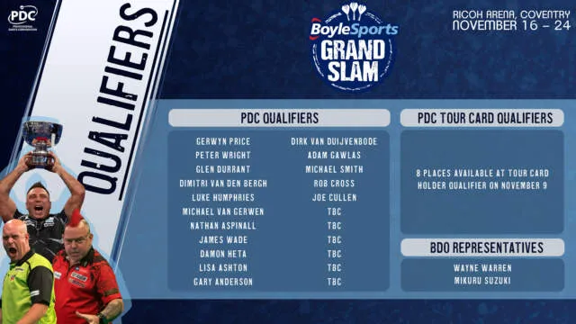 Er zijn nog 14 plekken te vergeven op dit moment en deze zijn toebedeeld aan 6 PDC qualifiers en 8 PDC Tour kaart qualifiers.