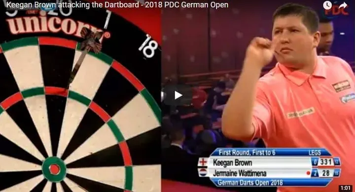 Jermaine Wattimena op de German Open. Brown ging er hard vanaf met 6-0 en gooide en gemiddelde van slechts 61,06. Hij kwam geen moment in zijn spel en dit leverde de nodige frustratie op. Na enkele legs kwam dit tot uiting in een kleine woede uitbarsting waarbij het dartbord het moest ontgelden. Beelden van dit opmerkelijk moment zie je hieronder.