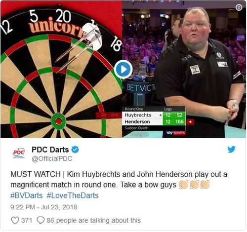 Kim Huybrechts won maandagavond in een thriller van John Henderson op de World Matchplay. Hiermee bereikte hij de laatste 16 en dit was hem tijdens de eerdere 6 edities niet gelukt. Ook nu was het met de hakken over sloot want de partij ontpopte zich tot een ware kraker waarbij het aankwam op een allesbepalend moment in de slotfase. Voor de liefhebbers die de partij hebben gemist is hieronder het slot nogmaals te bekijken. Na afloop sprak Arjan van der Giessen namens RTL 7 met de The Hurricane. De Belg was uiteraard dolblij dat zeven keer eindelijk scheepsrecht geeft. Het volledig interview is hieronder te bekijken.