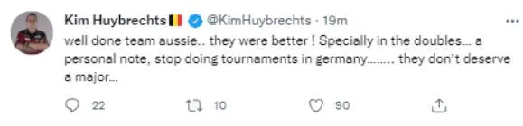 De World Cup of Darts was weer een bijzondere editie afgelopen weekend. Het publiek in Duitsland wordt echter niet door iedereen gewaardeerd. Nadat Australië in de kwartfinale te sterk was voor België plaatste Huybrechts onderstaand bericht op social media.